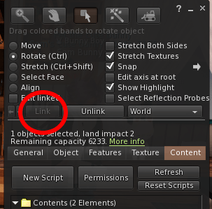 Once you have set up the main tip jar, place the main tip jar and linked tip jar where they are going. Once you link the tip jars they will move as one, so it is a good idea to have them placed before linking them. Once they are placed, right click the linked tip jar and select edit. With the edit window open, move your camera so it can see the main tip jar. While holding down the ctrl button, click the main tip jar. Both tip jars should now be highlighted. On the edit window, click Link. If the link is successful, the link button will now be greyed out.
